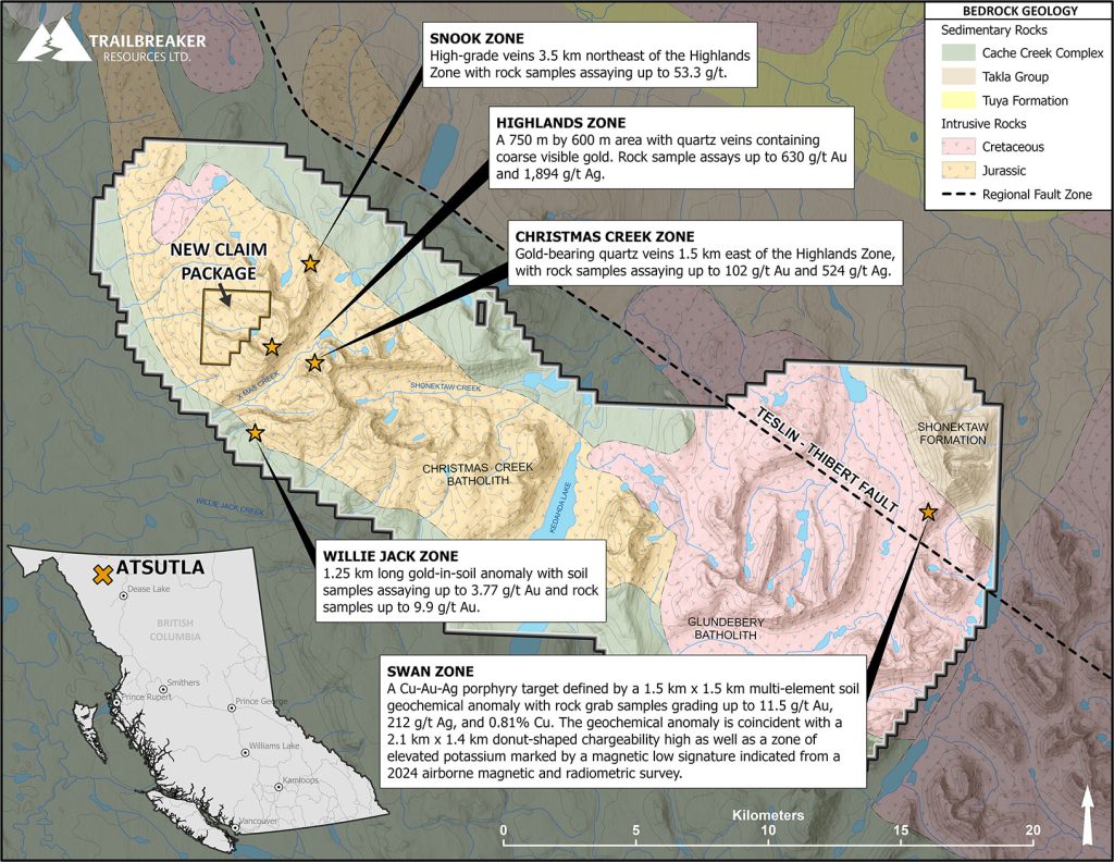 The Atsutla Gold project is a newly discovered high-grade gold project 120 km northwest of Dease Lake, BC. In addition to high-grade vein-hosted gold, the project also hosts a Cu-Au-Ag porphyry target called the Swan zone, which was further outlined through geophysical surveying in 2024 (see October 7, 2024 news release). Over the past three months, Trailbreaker consolidated key ground within the Atsutla Gold property claim boundary, particularly near the Highlands zone which hosts the highest gold grades sampled on the property to date (up to 630 g/t Au in grab samples).
