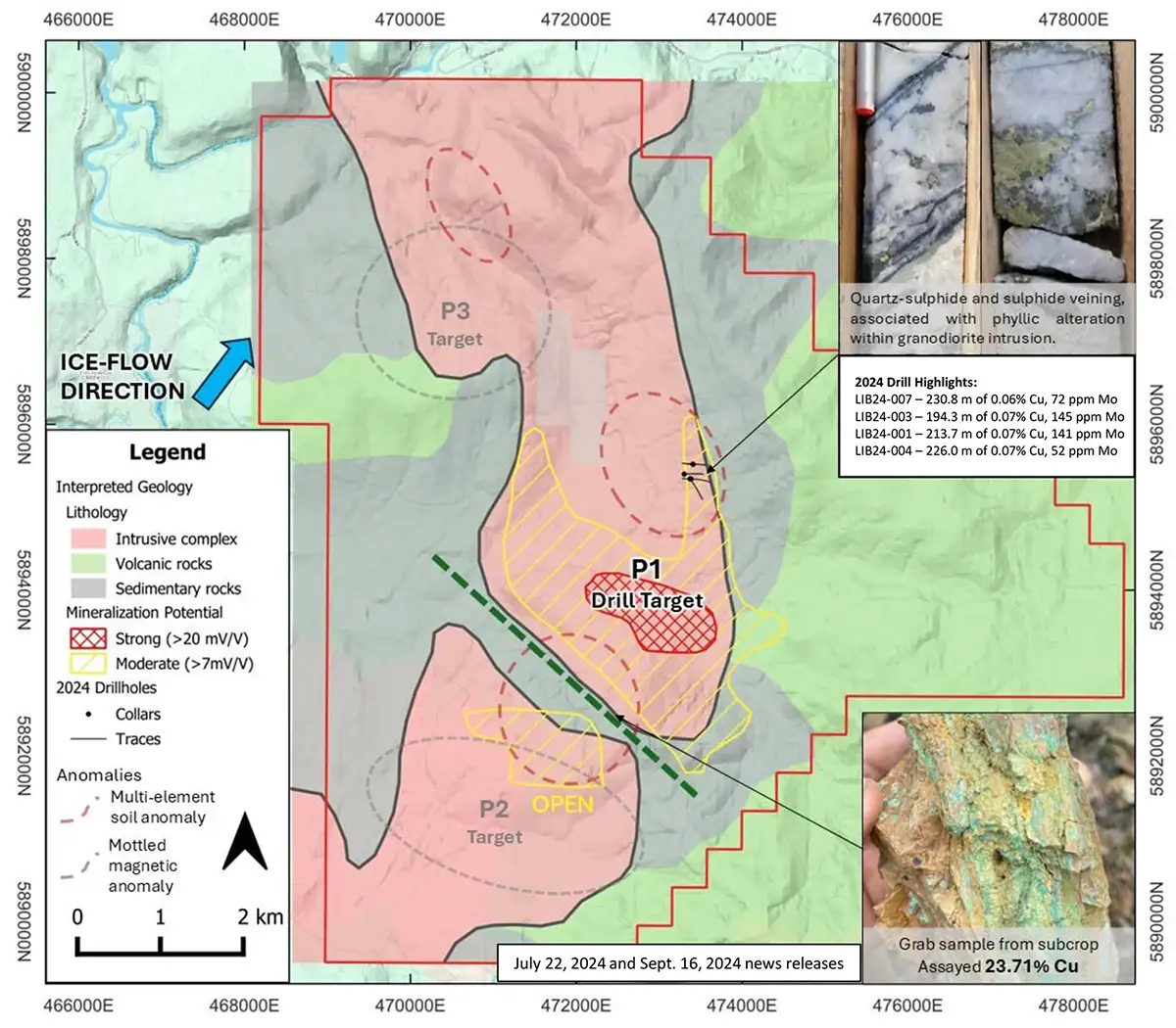 Post 2024 drilling, a large property-scale geochemical and geophysical program has delineated multiple porphyry targets on the property and has shown the 2024 drill campaign was completed at the margin of a much larger and stronger chargeability anomaly. The core of this strong (>20 mV/V) chargeability anomaly measures 1,600 m by 800 m, extending >700 m in depth, and is believed to represent increased sulphide content associated with a porphyry core. Furthermore, this chargeability anomaly is up-ice from the strongest Cu-Mo soil anomaly on the property. Prospecting within the southwestern portion of the property-scale geochemical anomaly has defined an area of high-grade copper mineralization, with grab samples assaying up to 23.71% Cu.